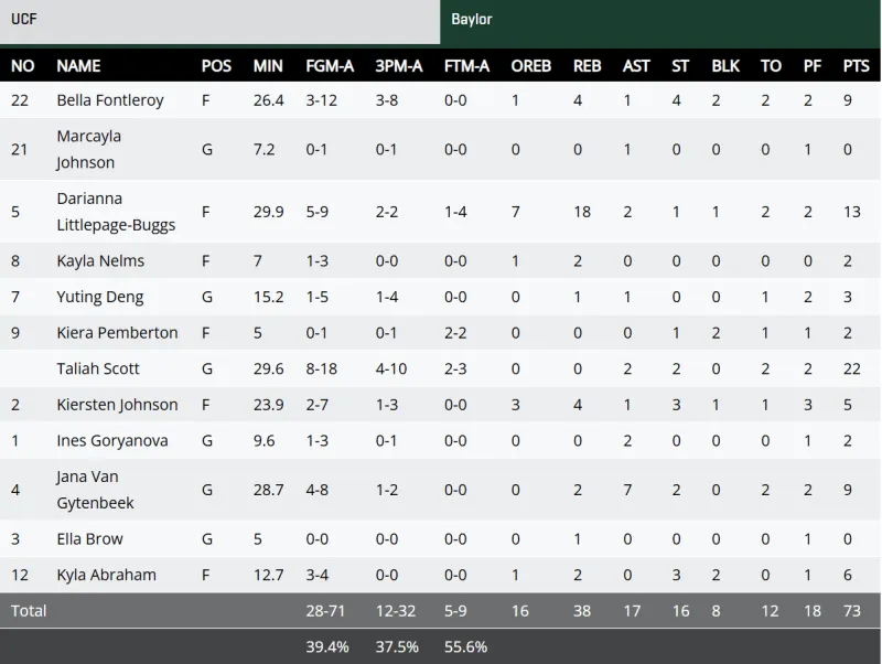 虎扑01月22日讯 今日NCAA女篮常规赛,贝勒大学73-48战胜中佛罗里达大学。